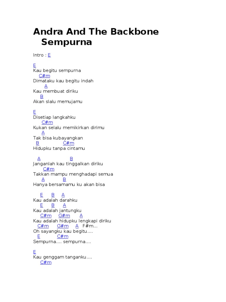 C G ku cinta kau bukan karena Am G F kau begitu berarti C G ku cinta kau bukan karena Am G F kau terlihat sempurna Dm G tapi karena hadir dirimu Dm G membuat aku merasa sempurna Reff. Em A bagiku kau segalanya. Andra And The Backbone Sempurna Intro E Verse E Kau begitu sempurna Cm Dimataku kau begitu indah A Kau membuat diriku B Akan slalu memujamu E Disetiap langkahku Cm Kukan selalu memikirkan dirimu A Tak bisa kubayangkan B Cm Hidupku tanpa cintamu A B Janganlah kau tinggalkan diriku Cm Takkan mampu menghadapi semua A.