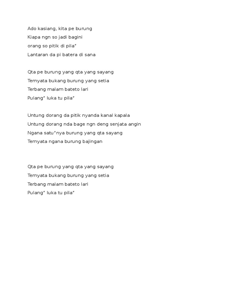 Yang dulu baku sayang. E tiap hari marah-marah A liat kita deng curiga B E sebenarnya apa yang salah E A aduh nyong tra usah ragu pe kita B E pe sarap bagini kita masih yayang punya. Gunawan Oto So Sambar Chord Intro E A B E E A B E Verse E Fm Sapa yang mo sangka kita pe hati B E Eh do eh boleh mo ancor bagini E A Orang yang so lama kita da sayang B E Ternyata mampu bekeng saki hati E A Samua do cuma lantaran harta B E Ngana boleh kase tinggal pa kita E A Parcuma do torang pe baku janji B E Mo kaweng kong mo sehidop semati Reff 1 A Adoh kasiang E Samua cuma jadi.