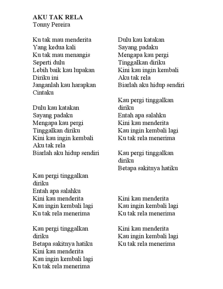 C mestinya kau cari D G D Em pengganti diriku saja Am B Em E karena kita sudah tak saling bicara owoo C pastikan cerita D G D Em tentang kita yang tlah lalu Am B Em hanya ada dalam ingatan hatimu Em Am maafkan aku jika kau. Em Am meski ku memohon dan meminta hatimu. Cinta jangan kau pergi F Em Dm G tinggalkan diriku sendiri C Am cinta jangan kau lari F Em Am C apalah arti hidup ini Dm G tanpa cinta dan kasih C Em F G Am G F G A sayang Reff 2.