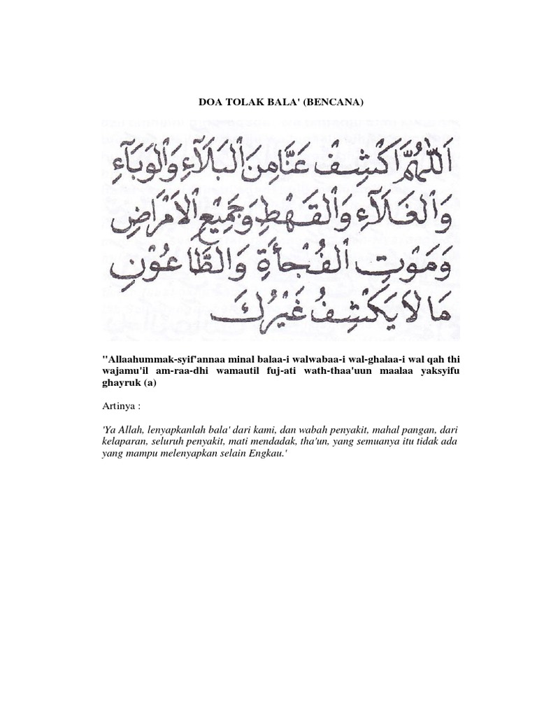 Doa ini bisa dibaca untuk mencegah bala terutama wabah penyakit. Doa tolak bala singkat. 1 dari 5 halaman.