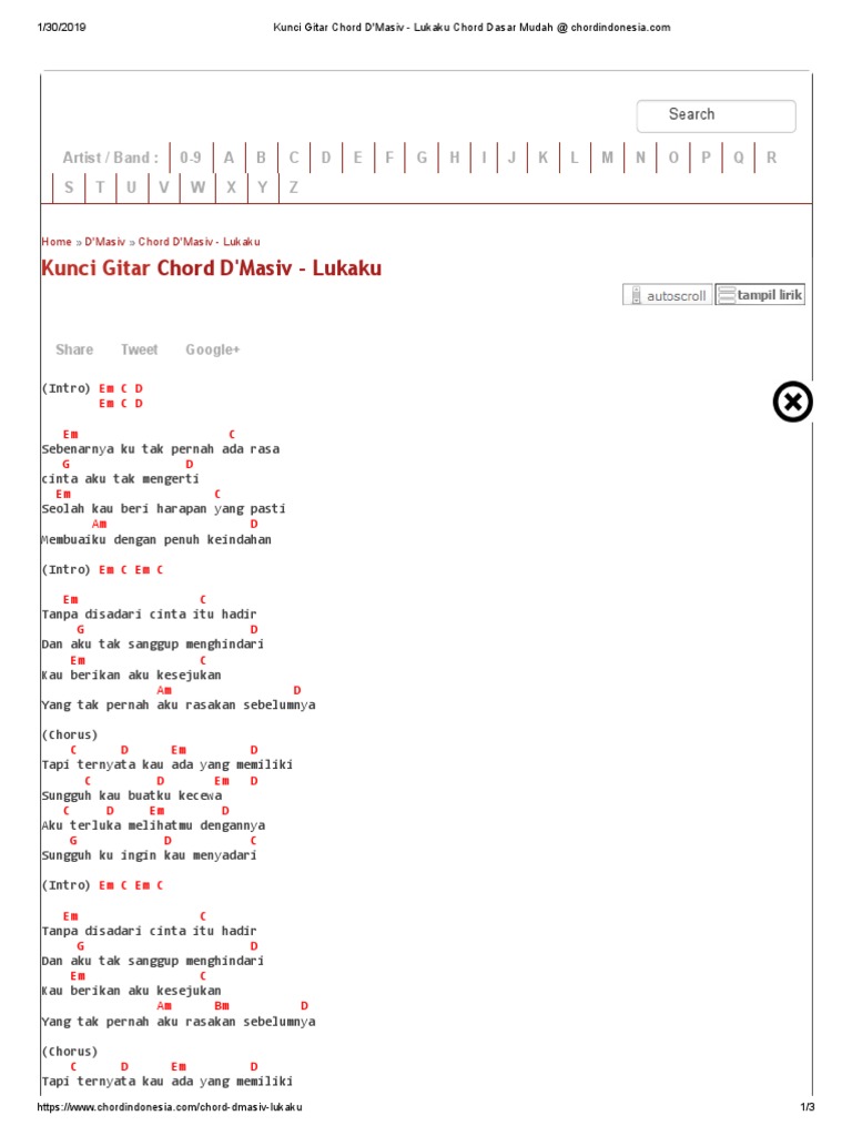 E D aku ora tegel. Verse C Em Pernah berpikir tuk pergi F G Dan terlintas tinggalkan kau sendiri C Em Sempat ingin sudahi sampai di sini F C Coba lari dari kenyataan G Tapi F Em Aku takut kamu pergi Dm7 G C Kamu hilang kamu sakit F Em Am Aku ingin kau di sini Dm G Di sampingku Fmaj7 Em7 Am7 Selama aku masih bisa bernafas Dm7 G C Masih sanggup. Am Dm gedene masalah sing neteki dalan.